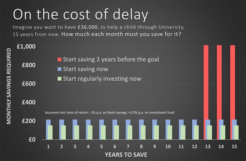 So, please remember this picture of the ‘cost of delay’ – when you think you should start saving for your important long-term goals.